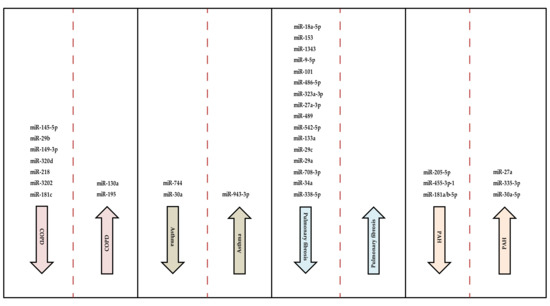 Schematic representation of miRNAs in pulmonary diseases as already cited from published articles. Arrows pointing downwards indicate the inhibition of the pathogenesis of the diseases by the miRNAs in the column. miRNAs in columns with arrows pointing upwards progress the development of the diseases. No miRNA was found to be involved in the progression of pulmonary fibrosis in this review.