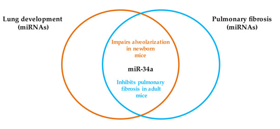 We observed a dual function of miR-34a, specifically in the late stage of lung development and pathogenesis of IPF. In newborn mice, miR-34a impaired alveolarization, and in adult mice, the miRNA alleviated the progression of pulmonary fibrosis [24,81]. Figure 3 illustrates the functions of miR-34a in the mouse lung.