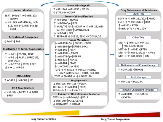 Non-coding RNAs involved in lung cancer initiation and progression along with the hallmark they affect. ↑, upregulation; ↓, downregulation; →, promotion; ┤, inhibition. Abbreviations: Apoptotic peptidase activating factor 1/2 (APAF1/2), BCL-2-like protein 11 (BIM), bromodomain-containing protein 4 (BRD4), cyclin E1 (CCNE1), E-cadherin (CDH1), cyclin dependent kinase 4 (CDK4), cyclin dependent kinase inhibitor 1A (CDKN1A), C-X-C motif chemokine receptor 4 (CXCR4), endoribonuclease Dicer (DICER), epidermal growth factor receptor (EGFR), endothelial PAS domain protein 1 (EPAS1), Erb-B2 receptor tyrosine kinase 4 (ERBB4), enhance of zeste 2 polycomb repressive complex 2 subunit (EZH2), F-box and WD repeat domain containing 7 (FBXW7), forkhead box O3 (FOXO3A), hypoxia inducible factor 1 alpha (HIF-1α), homeobox A3 (HOXA3), homeobox A5 (HOXA5), inhibitor of DNA binding 1 (ID1), interferon regulatory factor 2 (IRF2), Jumonji and AT-rich interaction (JARID2), minichromosome maintenance complex component 7 (MCM7), methyltransferase like 3 (METTL3), SMAD Family Member 3 (SMAD3), mechanistic target of rapamycin kinase (mTOR), metallothionein 1G (MT1G), protein tyrosine phosphatase receptor type U (PTPRU), programmed cell death 1 ligand 1 (PD-L1), programmed cell death 4 (PDCD4), phosphatidylinositol-3-kinase regulatory subunit 3 (PIK3R3), phosphatase and tensin homolog (PTEN), protein kinase C epsilon (PKC-ε), tumor necrosis factor ligand superfamily member 11 (RANKL), Ras p21 protein activator (RASA1), retinoblastoma-like protein 2 (RBL2), succinate dehydrogenase (SDH), sprouty related EVH1 domain containing 1/2 (SPRED1/2), sprouty 1 (SPRY1/3/4), SRC proto-oncogene non-receptor tyrosine kinase (SRC), signal transducer and activator of transcription 3 (STAT3), SUZ12 polycomb repressive complex 2 subunit (SUZ12), Simian virus 40 small T antigen (SV40 ST), transforming growth factor beta 1 (TGFβ), tissue inhibitor of metalloproteinases 2 (TIMP2), tumor protein 21 (TP21), tumor protein 53 (TP53), telomerase reverse transcriptase (TERT), vascular endothelial growth factor A (VEGFA), von Hipper-Lindau tumor suppressor (VHL), yes associated protein 1/tafazzin (YAP1/TAZ), Y-Box binding protein 1 (YBX1), zinc finger protein X-linked (ZFX).