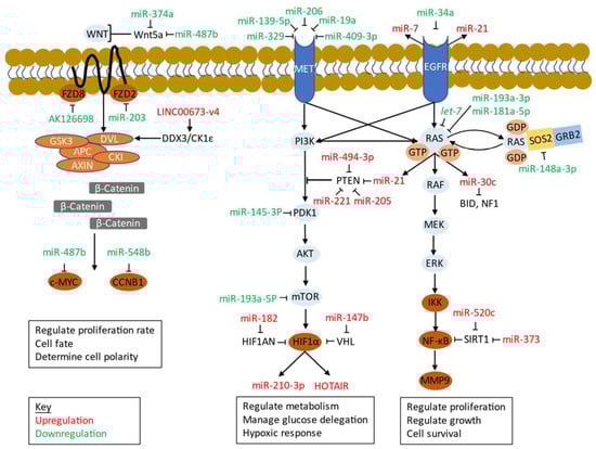 The MET signaling pathway can be altered through overexpression of MET and/or its ligand the hepatocyte growth factor, and genetic variation of the MET gene, both common in oncogenic processes []. Similar to the EGFR, through the activation of MET there are important downstream pathways including MAPK and PI3K that can be activated []. Sun and colleagues looked at miR-329 due to its presence in other cancers, and they found that it targets MET to induce negative regulation, which as a result inhibits proliferation and tumorigenesis of NSCLC []. Sun et al. has also noted similar findings with miR-139-5p [] and miR-206 []. Others have found that targeting of c-MET with miR-19a [] and miR-409-3p [] could inhibit downstream signaling of the Akt signaling pathway as well. Due to crosstalk between KRAS/MET and EGFR/MET, dual targeting of these signaling pathways via non-coding RNAs could potentially predict drug sensitivity, biomarker potential, and prognostic value [,].