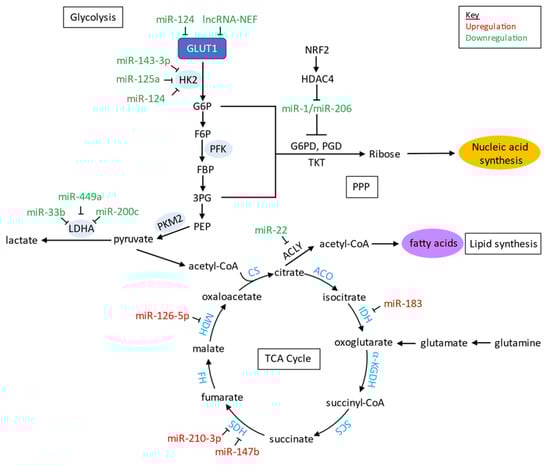 For cancer to effectively initiate proliferation and tumorigenicity, various metabolic pathways are altered to support the needs of the cancer cells. When studying the metabolism in lung cancer, there are distinct signaling pathways including apoptotic, growth promoting, and growth inhibiting that must be considered []. Out of these pathways the most notable are EGFR, MET, PI3K/Akt/mTOR, Ras/Raf/Mitogen-activated protein kinase/ERK kinase (MEK)/extracellular-signal-regulated kinase (ERK), and Wnt/β-catenin [] (Table 3; Figure 2). As a result, non-coding RNAs affecting the cell signaling pathways also have a role in regulation of different cell metabolism cycles including glycolysis, pentose phosphate pathway (PPP), tricarboxylic acid cycle (TCA), and lipid synthesis. Targeting of the enzymes within these metabolic cycles by non-coding RNAs has been reported, which could suggest alteration of cellular processes by controlling non-coding RNA regulation. miR-125a and miR-143 have been reported to target the glycolytic enzyme hexokinase 2 (HK2) by downregulation []. As for lactate dehydrogenase A, an enzyme in glycolysis responsible for imitation of lactate production, has targets serving as negative regulators include miR-200c [], miR-33b [], and miR-449a []. Additionally, lncRNA CRYBG3 overexpression has been reported to be associated with LDHA upregulation []. Glycolysis harbors another important pathway known as the PPP. Singh et al. looked at regulation of miR-1 and miR-206 by nuclear factor erythroid-2-related factor 2 (NRF2) which serves as a tumor initiator once activated []. Once these miRNAs are regulated, progression of the PPP and TCA cycling can occur. As for the TCA cycle, enzymes such as succinate dehydrogenase (SDH), isocitrate dehydrogenase (IDH), and malate dehydrogenase (MDH) have been identified as targets for various miRNAs (Figure 3). Upregulation of miR-147b repressed enzymatic activity of SDH, initiating a pseudohypoxia signaling response []. Similarly, upregulation of miR-210 decreased enzymatic activity of SDHD and furthered activity of HIF-1α []. This idea of adaptation to stress environments is also present via miR-183 and IDH2 regulation []. Vohwinkel et al. compared IDH2 response to elevated CO2 with IDH2 response to upregulated miR-183 in epithelial lung cancer cells and found that both downregulated IDH2 []. The adaptation of cancer cells to the stress environment by reprogramming metabolic processes could serve as a leading cause of witnessed therapeutic resistance, furthering cancer’s progression. Complexes, such as the miR-182-PDK4 axis, have been reported to regulate pyruvate dehydrogenase which is an essential part of TCA cycling and lipogenesis []. Other important targets include miR-22 downregulation on ATP citrate lyase (ACLY), which allowed for ACLY-mediated lipogenesis and caused increased metastatic effects []. Enzymatic activity of MDH1 can be altered as well with miR-126-5p in NSCLC, and with greater doses initiated cell toxicity []. The role of non-coding RNAs as regulators in a variety of pathways makes them an important part of studying tumor initiation and progression.