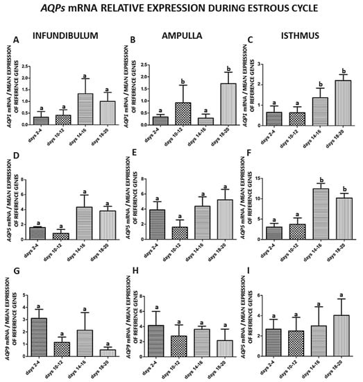 The expression patterns of Aquaporin 1 (A–C), Aquaporin 5 (D–F) and Aquaporin 9 (G–I) genes in porcine oviduct separated into infundibulum, ampulla and isthmus from the estrus cycle (days 2–4, 10–12, 14–16, 18–20). The samples were subjected to quantitative polymerase chain reaction (qPCR) analysis and normalized to the geometric mean of 18S RNA and Cyclophilin A (PPIA) expression. Each of the graphs marked with a capital letter indicates a specific part of the oviduct. Values are expressed as means ± S.E.M from five individuals, each performed in triplicate (p < 0.05) (n = 5). Statistically significant differences between the part of the oviduct to day of the estrous cycle are indicated by different letters (a, b).