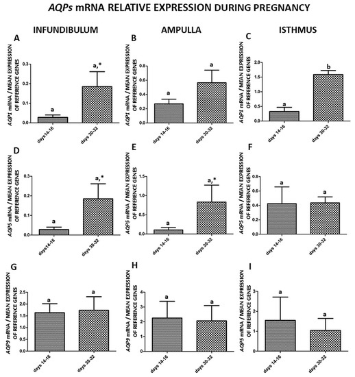 The expression patterns of Aquaporin 1 (A–C), Aquaporin 5 (D–F), and Aquaporin 9 (G–I), genes in porcine oviduct separated into infundibulum, ampulla and isthmus from early pregnancy (days 14–16 and 30–32). The samples were subjected to qPCR analysis and normalized to the geometric mean of 18S RNA and PPIA expression. Each of the graphs marked with a capital letter indicates a specific part of the oviduct. Values are expressed as means ± S.E.M from five individuals, each performed in triplicate (p < 0.05) (n = 5). Statistically significant differences between the part of the oviduct to day of the estrous cycle are indicated by different letters (a, b) and trends (p < 0.1) by *.