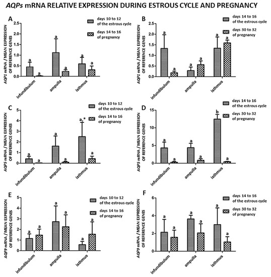 Comparison of the expression patterns of AQP1, 5, 9 genes in porcine oviduct separated into infundibulum, ampulla and isthmus from the estrus cycle (days 10–12 and 14–16) and early pregnancy (days 14–16 and 30–32). (A,C,E) summarized comparison between medium luteal phase (days 10–12) and pregnancy (days 14-16). (B,D,F) summarized comparison between late luteal phase (days 14–16) and pregnancy (days 30–32). The samples were subjected to qPCR analysis and normalized to the geometric mean of 18S RNA and PPIA expression. Each of the graphs marked with a capital letter indicates a specific part of the oviduct. Values are expressed as means ± S.E.M from five individuals, each performed in triplicate (p < 0.05) (n = 5). Statistically significant differences between the part of the oviduct from the estrous cycle and early pregnancy are indicated by different letters (a, b) and trends (p < 0.1) by *.