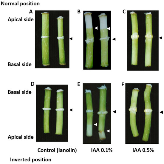 The effect of indole-3-acetic acid (IAA) at concentrations of 0.1% and 0.5% on the formation of the secondary abscission zone in the internode segments of B. calycinum. (A,D): lanolin (control) applied only to the middle of the segments in the normal position (A) and inverted position (D); (B,E): IAA at 0.1% was applied to the middle of the segments in the normal position (B) and inverted position (E); (C,F): IAA at 0.5% was applied to the middle of the segments in the normal (C) and inverted position (F). The segments were incubated under light conditions and photographed 9 days after the treatment. Black arrowheads indicate the place of treatment, and white arrowheads indicate the place of the formation of the secondary abscission zone.