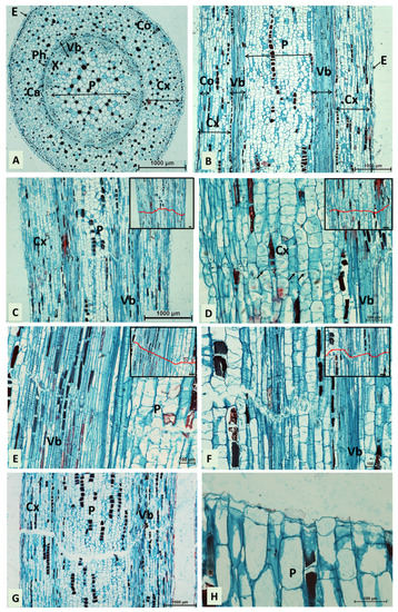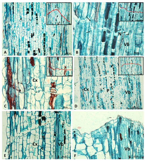 The transverse and longitudinal sections of the internode of B. calycinum treated with lanolin only (control) are shown in Figure 2A,B. The outer surface of the stem is covered by dermal tissue comprising of epidermis with pronounced cuticles, and a few layers of collenchyma cells. Further into the stem, the cortex parenchyma comprising of large, vacuolated cells is observed, and from inside it adheres to a ring of vascular tissue with xylem and phloem separated by a cambial zone. The central part of the stem (pith) is occupied by a core parenchyma with round, vacuolated cells, increasingly larger towards the center.
