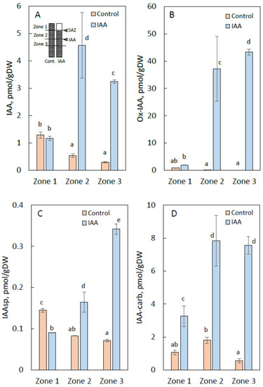 The endogenous levels of Ox-IAA, a major metabolite of IAA, in zone 2 and zone 3 of IAA-treated stem segments were also extremely high, although very low levels were recorded in the control stem segments, as displayed in Figure 4B. As shown in Figure 4C,D, endogenous levels of IAAsp and IAA-carb in zones 1 to 3 were almost same, with a gradual increase from zone 1 to zone 3. Endogenous levels of IAA-carb were about ten times higher than those of IAAsp. The reason for these results has not yet been clarified, but there are two possible explanations. One is that exogenously applied IAA moved basipetally and then metabolized into OxIAA, IAAsp and IAA-carb. Another is that exogenously applied IAA immediately metabolized into these metabolites and then these compounds moved basipetally rather than acropetally and similarly to IAA. IAA exogenously applied to the stem segments was also metabolized into IAA-Glut, 4-Cl-IAA, 5-Cl-IAA, IAA-Me, and IBA. Endogenous levels of these metabolites were almost similar and had relatively small differences when compared to the control stem segments shown in Table S1.