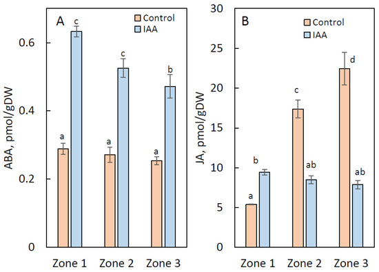 The effect of IAA at a concentration of 0.1% applied to the middle of the internode segments of B. calycinum at endogenous levels of ABA (A) and JA (B). Others are the same as in Figure 4.