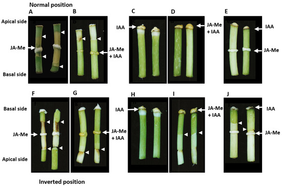 The effect of IAA 0.5%, JA-Me 0.5% and their mixture on the formation of the secondary abscission zone depending on the place of treatment in the excised segments of the internode of B. calycinum. After the treatment, the internode segments were kept in the normal position (A–E) and the inverted position (F–J), and photographed ten days after treatments; (A,F) JA-Me applied on its own to the middle of the internode and lanolin to the top; (B,G) IAA applied together with JA-Me to the middle of internode and lanolin to the top; (C,H) IAA alone applied to the top of internode; (D,I) JA-Me and IAA applied together to the top; (E,J) JA-Me applied to the middle and IAA applied to the top of the segment. White arrows indicate the place of treatment, and white arrowheads indicate the place of the formation of the secondary abscission zone.