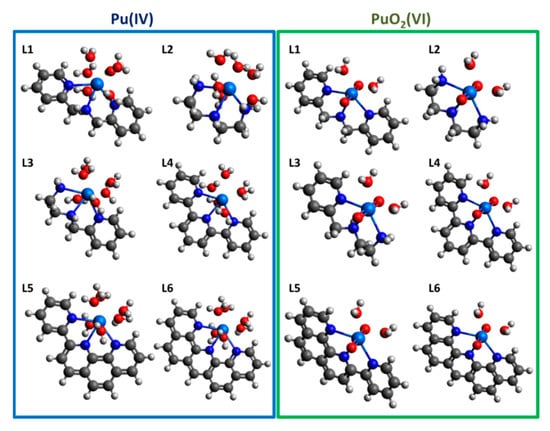 Optimized structures of Pu (IV) and PuO2(VI) with the suggested nitrogen tridentate ligands in aqueous solution (structural chemical formulas and coordinates of all structures are listed in SI).