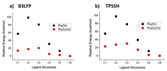 Relative energy of each structure compared with the most stable complex (Pu–L6) using different functionals: (a) B3LYP, (b) TPSSH.