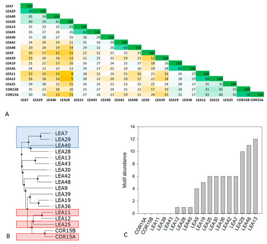 Percent identity matrix (A) and dendrogram (B) of all 18 members of the late embryogenesis abundant (LEA)_4 Pfam family from Arabidopsis thaliana. In A, green colors indicate high, yellow colors low sequence identity. Proteins chosen for experimental analysis are boxed in blue (LEA7 clade) and red (COR15A clade) in B. Abundance of the conserved 11-mer motif TAQAAKEKAXE in the 18 LEA_4 proteins calculated with the FIMO tool is shown in (C).