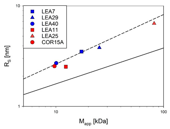 Accordingly, Figure 4 shows RS as a function of the molecular mass for the six investigated LEA proteins in log-log representation in relation to the scaling behavior of globular proteins and IDPs under fully hydrated conditions. All essentially follow the scaling law for IDPs with the exception of LEA11, which seems slightly more compact.