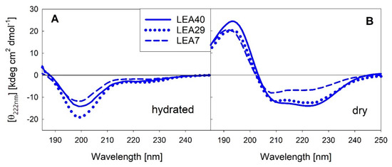 As already reported for the COR15A clade, the LEA7 clade proteins are essentially disordered in dilute solution and fold into mainly α-helical structure upon desiccation. α-helical structure is less distinct in LEA7 compared to the other proteins.