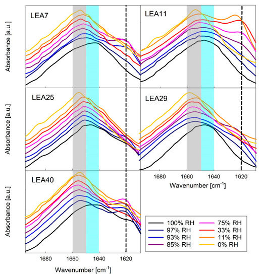 Amide I region of Fourier-transform infrared (FTIR) spectra of five out of the six LEA_4 family proteins in different relative humidity (RH) conditions. Peak maxima indicate unstructured proteins (1650–1640 cm−1, shaded blue), α-helix (1660–1650 cm−1, shaded grey) and β-sheet aggregates (about 1620 cm−1, dashed line). The spectra in each panel are offset from each other for better visibility. A corresponding dataset for COR15A has been published previously [34].