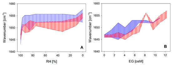 A direct comparison of the coil-helix transitions between both LEA_4 clades as a function of RH and EG is shown in Figure 7. The wavenumber shift was most prominent already at rather high RH with an equilibrium reached at 93–85%. The transition was similar in both clades in response to decreasing RH (Figure 7A). However, at intermediate and low RH, the Amide I peak maxima of the proteins of the LEA7 clade were on average around 5 cm−1 higher than those of the proteins of the COR15A clade, indicating a shift in the coil-helix equilibrium towards a higher ratio of α-helical structure in the former case. The corresponding transitions in increasing concentrations of EG (Figure 7B) are characterized by similar minimum and maximum peak wavenumbers at the lowest and highest EG concentrations between both clades. However, higher EG concentrations are necessary to induce the coil-helix transition in the proteins of the COR15A clade compared to the LEA7 clade, which is indicated by a shift of the respective area along the x-axis.
