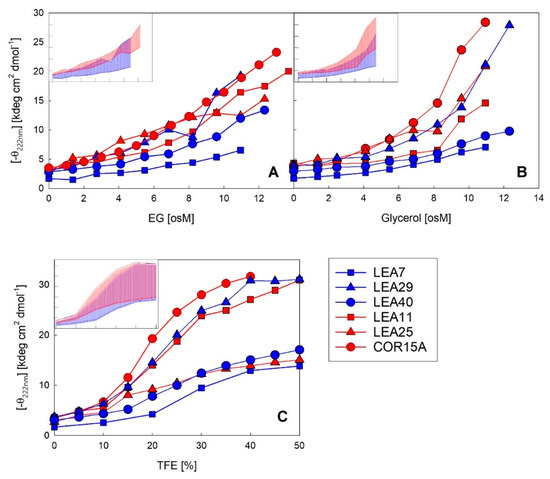 The coil-helix transitions were similar in EG (Figure 8A) and glycerol (Figure 8B) for all six LEA_4 proteins, except at very high osmolarities (>8 osM) in the case of COR15A and LEA25, where α-helicity strongly increased in glycerol, but not in EG. A coil-helix transition was similarly apparent in increasing concentrations of TFE (Figure 8C). We observed a clear separation of two subsets of LEA proteins in TFE, one including COR15A, LEA11 and LEA29, which at high TFE concentrations reached an average α-helicity of almost 100%. The other subset, comprising LEA7, LEA25 and LEA40, showed an average α-helicity of only about 40–50% in 50% TFE. Interestingly, the strong folders had a higher folding potential than they realized in response to high solution osmolarity, as evident when comparing folding in TFE and EG. By contrast, the weak folders seemed to fully exploit their folding capacity in response to high solution osmolarity, again comparing TFE and EG. The distinction between strong and weak folders in TFE did not correspond to the two clades of LEA_4 proteins. Each clade included at least one strong and one weak folder. Accordingly, the variance within the clades (Figure 8, insets) was high and both clades widely overlapped with a small tendency towards higher α-helicity for the COR15A clade.