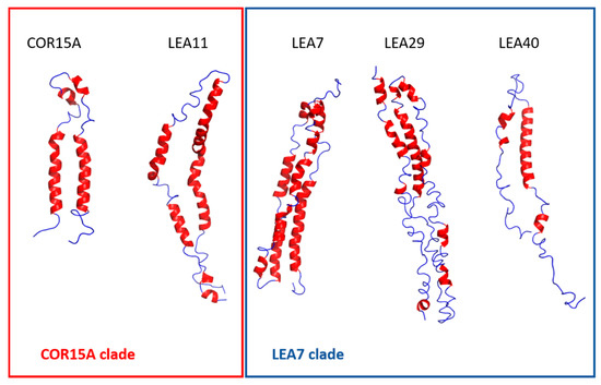 As in silico sequence analysis indicated highly similar physicochemical characteristics of the LEA_4 proteins, we decided to take a closer look at structural and functional properties of the two most distant clades within the LEA_4 Pfam family (Figure 1B), comprising three proteins each. In the following, these will be called the LEA7 clade (LEA7, LEA29 and LEA40) and the COR15A clade (COR15A, LEA11, LEA25). It should be mentioned that the COR15A clade contains two more proteins, LEA12 and COR15B. We did not include these two proteins in our analysis, because they are highly similar to LEA11 and COR15A, respectively (Figure 1A,B).