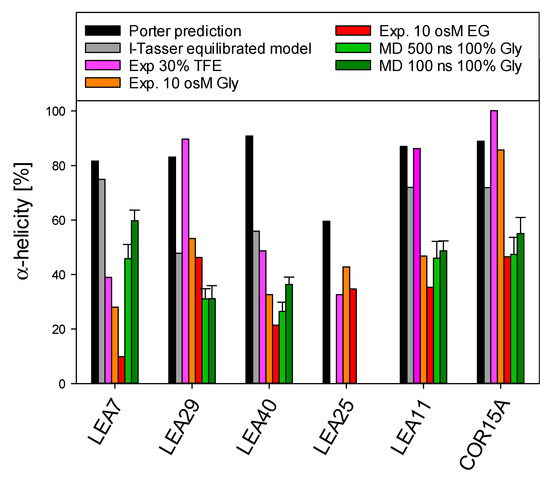 Comparison of α-helical structure of the six LEA_4 proteins from prediction, MD simulation and experiment. Error bars depict SD of five simulation replicate trajectories. Gly—glycerol.