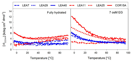 Several LEA proteins accumulate in response to low temperature and may stabilize cellular components during freezing. COR15A is a well-described example of how membrane stabilization increases plant freezing tolerance in vivo [19]. Therefore, we recorded temperature dependent changes in α-helicity using the far-UV CD signal at 222 nm under fully hydrated conditions (Figure 11A) and at high solution osmolarity in 7 osM EG (Figure 11B).