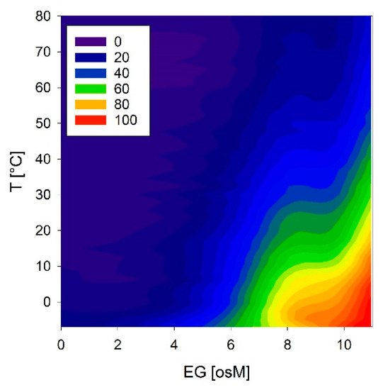 We investigated these conformational reactions to both temperature and osmolarity in more detail using COR15A, which showed the strongest effects. Temperature scans were obtained at solution osmolarities ranging from 0 to 11 osM EG (Figure 12). COR15A was able to access the full conformational space ranging from complete random coil to 100% α-helicity in response to the modulation of temperature and osmolarity. It is interesting to note that the combinations of both parameters resulting in the highest α-helicities were apparently close to the environmental situation the protein might experience in vivo during mild freezing.