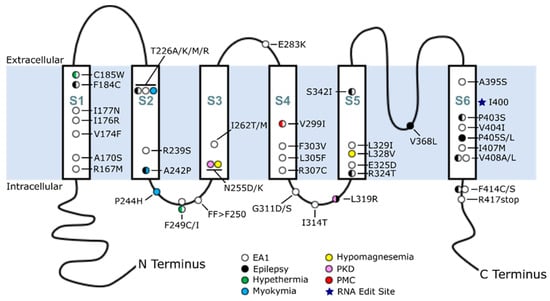 With the discovery of a KCNA1 mutation as the molecular cause of EA1, the gene became the first potassium channel gene associated with human disease []. Since that time, KCNA1 mutations have also been associated with several other diseases, including epilepsy and hypomagnesemia. These diseases can occur alone or comorbid with EA1. The spectrum of phenotypes exhibited by patients with KCNA1 mutations is broad, and some patients exhibit unique symptoms not shared by most others. Examining the different diseases caused by mutations in KCNA1 and mapping the structural locations of these variants reveals patterns that may underlie the relationship between a specific genotype and phenotype.