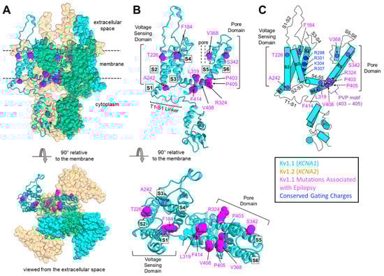 Modeling KCNA1 mutations associated with epilepsy. (A) Model of a Kv1.1–Kv1.2 heterotetramer built using a homology model of human Kv1.1 (blue) and human Kv1.2 (orange), which were made with SWISS-MODEL [] using the crystal structure of rat Kv1.2 (RCSB PDB: 3LUT) []. Human Kv1.1 and Kv1.2 share 80% and 99.4% sequence identity with rat Kv1.2, respectively. One Kv1.1 subunit is shown in ribbons, with epilepsy-associated mutations shown in van der Waals (vdW) representation colored magenta, and other subunits shown in vdW representation. (B) Homology model of a single Kv1.1 subunit with epilepsy-associated mutations shown in magenta in vdW representation. (C) Two-dimensional representation of a human Kv1.1 subunit. Magenta circles represent mutations associated with epilepsy; blue circles are conserved gating charges in the voltage-sensing domain. The highly conserved PVP motif is noted in purple.