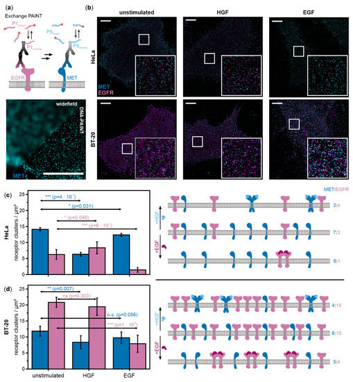 Several studies have provided evidence of interactions between MET and EGFR upon ligand binding in several different cell types. This suggests that receptor cross-interactions are governed by a complex system of factors, including cell type, absolute and relative receptor expression levels, and ligand stimulation. Correlation of these factors in the bigger context of cancer therapy requires understanding the basic principles and governing patterns of transient receptor cross-interaction and possible quantification of the size of the effect depending on various cellular and environmental factors. Thus, it is crucial to develop systematic and highly sensitive methods to study EGFR and MET behavior upon ligand stimulation. In this work, we used single-molecule super-resolution microscopy to visualize single receptor clusters of EGFR and MET in two cancer cell lines. Exchange-PAINT (Point Accumulation for Imaging in Nanoscale Topography) [24,25] was applied to analyze and quantify EGFR and MET receptor densities and colocalization in situ. Receptor dynamics in living cells were measured by single-particle tracking [26] and stimulation by HGF as well as EGF. A breast cancer cell line (BT-20) and cervical cancer cells (HeLa) were selected due to distinctly different MET:EGFR expression levels. For the first time, we detected heteromeric clusters of MET and EGFR directly in cell membranes.
