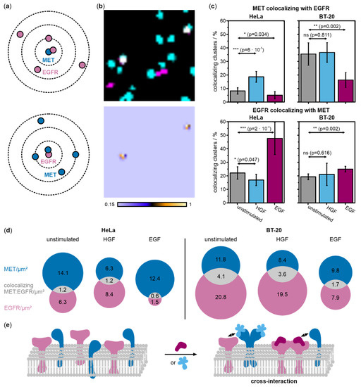We introduce a quantitative, imaging-based approach to identify cross-interactions between MET and EGFR in HeLa and BT-20 cells, which exhibit distinctly different receptor expression ratios [27,28]. Using single-molecule super-resolution microscopy (Figure 1a) in combination with single-molecule colocalization analysis, we visualized single receptor complexes with nanoscale resolution in cells and found direct proof of in situ formation of heteromeric complexes of MET and EGFR.