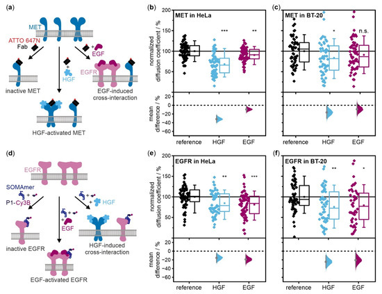 Diffusion dynamics of MET and EGFR in HeLa and BT-20 cells after stimulation with HGF and EGF studied by SPT indicate receptor cross-interactions. (a,d) MET was tracked by adding Fab-ATTO 647N. EGFR was tracked by adding EGFR-SOMAmer reagent modified with a P1-docking strand and P1-Cy3B for PAINT imaging. The Fab fragment and the SOMAmer reagent bind to the respective receptor but do not activate them. For observations of direct activation or possible cross-interaction, unlabeled HGF (light blue) or EGF (purple) were added to the samples. Diffusion coefficients of MET and EGFR in resting and activated cells (each n = 50 from at least three independent experiments) were determined in (b,e) HeLa and (c,f) BT-20 cells. All diffusion coefficients were normalized against reference measurements of ligand-untreated cells for all types of treatment. The box plots of diffusion coefficients display the 5th percentile, 25th percentile, median (line), mean (square), 75th percentile, and 95th percentile. Results of two-sample t-tests for comparison of ligand-treated cells with the reference are depicted above the box plots (p > 0.05 no significant difference between populations (n.s.), p < 0.05 significant difference (*), p < 0.01 very significant difference (**), p < 0.001 highly significant difference (***)). The lower y-axes of the graphs depict the distribution of mean differences [34] of each condition in comparison to the unstimulated sample. The mean difference is represented as a grey dot; each 95% confidence interval of the mean difference distribution is indicated by vertical grey error bars.