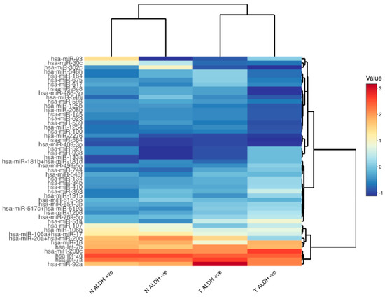 Differential expression of microRNAs in normal and tumor ALDEFLUOR positive and negative cells. This figure shows a focused heatmap for the subset of miRNAs based on statistical analysis (cutoff of p < 0.1) of all patient cases assessed by Nanostring profiling. The results are expressed as the average of normalized counts for the four types of sorted cell samples, (ALDH-positive and -negative cells for normal (N) and tumor (T)), which is converted to log2 and scaled to the mean of each sample. The list of differentially expressed miRNAs shown in Figure 2 is given in Supplementary Table S2.