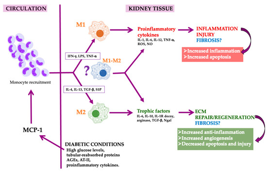 Among the bioactive molecules capable of changing the phenotype, sphingosine 1-phosphate (S1P) has been described. Sphingolipids are pleiotropic regulators of cellular physiology that modulate diverse pathways of cell death, inflammation and immunity. Phosphorylation of sphingosine by sphingosine kinases (SK1) leads to the formation of S1P. Long term hyperglycemia and oxidative stress could activate SK1 and increase the production of S1P, eliciting expression of proinflammatory adhesion molecules in endothelial cells, vascular smooth muscle cell and glomerular mesangial cell proliferation. Living in the environment of hyperglycemia and oxidative stress, as occurs in diabetes, for a long time, activate SK1 and increase S1P synthesis [75]. Yagobian et al. demonstrates that inhibitors of the formation of S1P reduce tubulointerstitial renal inflammation and fibrosis in diabetic nephropathy [76]. By the contrary, other studies have shown that FTY720, a S1P agonist selectively inhibits lymphocyte migration and alleviates ischemia–reperfusion injury after renal fibrosis by reducing the release of ECM and reducing the progression of glomerulosclerosis [77]. Thus, while the increased expression of S1P under diabetic conditions seems clear, results on its involvement in diabetes progression does not seem so clear and its potential involvement in macrophage phenotype under diabetic conditions remains unexplored.