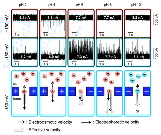 This principle helps to control the mode and speed of translocation. Nir et al. slowed down the translocation speed of ubiquitin by adjusting the pH value of the buffer near the pI, thereby realizing sensing and characterization of small globular proteins using solid-state nanopore []. At pH 7.2, most events could not be detected due to their extremely short dwell time. However, lowering the pH to 7.0 resulted in a significant increase in dwell time, making these events within a reliable measurement bandwidth []. Jubery et al. came up with an idea that electroosmosis and electrophoresis force could be utilized to separate nanoparticles []. They used high-density lipoprotein (HDL) and low-density lipoprotein (LDL) as the sample nanoparticles and designed a nanopore-based platform. Numerical simulations proved the feasibility of this idea. In other words, electroosmosis effect sometimes needs to be accounted for to help clarify the protein’s translocation.