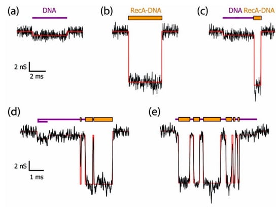 Example of current traces of differently RecA-coated DNA using a 30 nm diameter pore fabricated in 20 nm thick SiN membrane: (a) bare DNA; (b) fully RecA-coated DNA; (c) partially RecA-coated DNA; and (d–e) more complex events. Reprinted with permission from Nano Lett. 2010, 10, 1, 324–328. Copyright 2009 American Chemical Society.