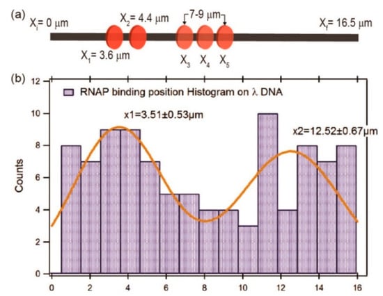 (a) Sketch map of ideal RNAP binding locations; and (b) histogram and Gaussians fitting of measured RNAP biding locations. Adapted with permission from ACS Sens. 2019, 4, 1, 100–109. Copyright 2018 American Chemical Society.