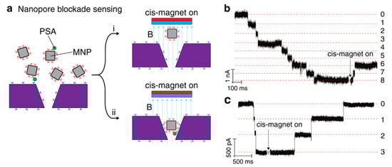 Chuah et al. introduced anti-PSA (prostate-specific antigen) antibodies on the surface of silicon nitride nanopores, combined with anti-PSA modified magnetic nanoparticles, forming an immuno-sandwich to capture the PSA molecules (Figure 4a) []. If the PSA molecule is captured by magnetic nanoparticles, it cannot be removed when the magnetic field is reversed (cis-magnet on), but the unbound PSA magnetic nanoparticles can be removed (Figure 4a), thereby avoiding false signals. When the nanopore was blocked, long-term large changes in current were observed (Figure 4b). They used whole blood as a sample to measure PSA concentration, and the result shows a correlation between the number of detected irreversible blockades and PSA concentration, almost consistent with the concentration obtained by a commercial enzyme-linked immunosorbent assay (ELISA) kit. This work provided an idea of active sensing mechanism. Instead of waiting for the molecules to reach near the pore through diffusion, actively capturing them may be a solution to eliminate false signals and reduce the detection limit while improving specificity.