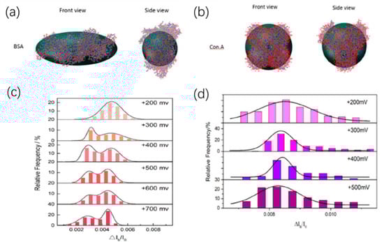 (a) Three-dimensional conformation of non-spherical BSA and (b) spherical con.A; and (c) histograms of the relative current blockade for non-spherical BSA and (d) spherical con.A. Adapted with permission from Anal. Chem. 2018, 90, 23, 13826–13831. Copyright 2018 American Chemical Society.