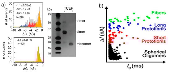 (a) The amplitude histogram of VEGF translocating events. SDS gel electrophoretic image of VEGF before and after reduction (right panel); and (b) Aβ conformation analysis using a lipid bilayer-coated nanopore based on ΔI of translocation signals. (a) Reproduced under the terms of the Creative Commons Attribution License (CC-BY) []. Copyright 2018, The Authors, published by Nature Publishing Group. (b) Reprinted with permission from ACS Nano 2012, 6, 7, 5909–5919. Copyright 2012 American Chemical Society.
