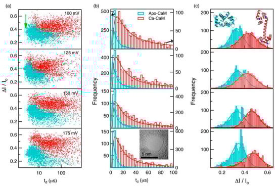 (a) Scatterplots of fractional current blockades vs. dwell times for Apo-CaM and Ca-CaM; (b) dwell-time distributions for Apo-CaM and CaCaM; and (c) fractional current amplitude distributions for Apo-CaM and CaCaM. Reprinted with permission from ACS Nano 2017, 11, 6, 5706–5716. Copyright 2017 American Chemical Society.