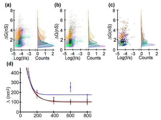 Translocating events of hSTf at: (a) pH 8; (b) pH 6; and (c) pH 4. Lines of different color represent different voltages: 800 mV (blue trace), 600 mV (magenta trace), 400 mV (green trace), 200 mV (gray trace), and 100 mV (orange trace). (d) Excluded volume with applied voltage at pH 8 (black trace), pH 6 (red trace), and pH 4 (blue trace). Solid lines correspond to an exponential fit. Adapted with permission from ACS Nano 2019, 13, 4, 4246–4254. Copyright 2019 American Chemical Society.