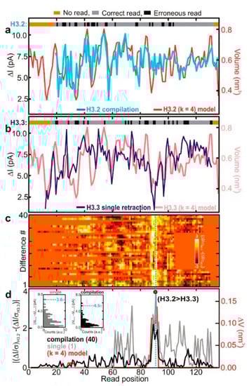 Sequence analysis of protein (a) H3.2 variant and (b) H3.3 variant; (c) heat map of differences of H3.2 and H3.3 current blockades; and (d) the red line shows the position of different amino acid between H3.2 and H3.3. Reprinted with permission from ACS Nano 2017, 11, 6, 5440–5452. Copyright 2017 American Chemical Society.