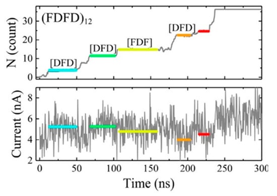 Translocation events of the (FDFD)12 peptide at a 600 mV. Adapted with permission from J. Phys. Chem. C 2018, 122, 4, 2070–2080. Copyright 2018 American Chemical Society.