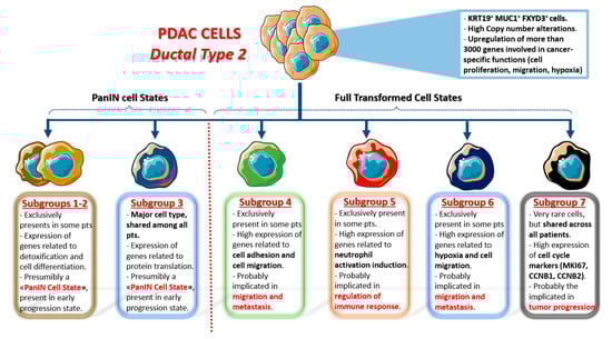More importantly, t-SNE analysis applied to Ductal type 2 cluster identified at least seven different sub-clusters within this cell category, greatly expanding the previously imagined concept of intratumoral heterogeneity (see Figure 1 for a detailed description of each sub-cluster). Sub-clusters 1-2-3 upregulate genes involved in cell differentiation, pancreatic secretion and mRNA translation (all normal pancreatic functions): hence, they could be viewed as “PanIN cell states”, not yet fully transformed. On the other side, sub-clusters 4-5-6-7 show upregulation of several genes involved in different malignant processes. Sub-groups 4–6 upregulate genes related to cell adhesion and migration pathways (thus, they are presumably involved in metastasis), while sub-cluster 5 is involved in immune cell regulation, and sub-cluster 7 (the only one present in all 24 patients) highly upregulates cell cycle genes (thus, it is presumably involved in cancer progression). The latter sub-clusters could be viewed as “PDAC cell states”, composed of fully transformed malignant cells with different functions in terms of microenvironmental modulation properties and metastatic potential.