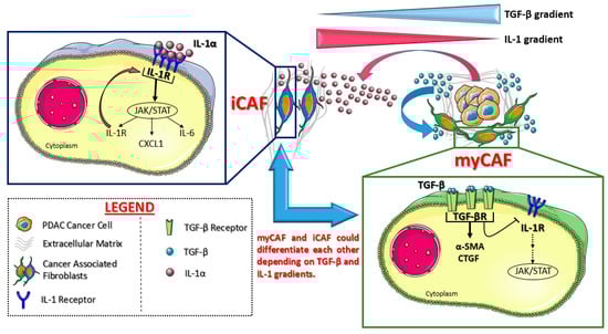 In 2019, Biffi et al. [] showed that pancreatic cancer cells could secrete a great amount of both TGF-β and IL1 cytokines: TGF-β strongly activates TGF-β signaling in myCAFs adjacent to tumor cells preventing the induction of iCAF phenotype (by suppressing IL1R1 expression). On the other side, tumor-secreted IL1 activates IL1 signaling in CAFs that are located farther away from tumor cells: in these CAFs, IL1 leads to a strong JAK/STAT signaling activation, which is responsible for the establishment of the iCAF secretory phenotype, and a positive feedback loop on IL1R1, the receptor for IL-1 (Figure 2). Therefore, these two CAF populations seem to be even more interconvertible cell states, rather than terminally differentiated cells, depending on their location within tumor microenvironment. Moreover, JAK inhibition in PDAC mouse models could rapidly shift iCAF to a Myofibroblastic phenotype, supporting the idea of microenvironmental directed drugs as a new therapeutic possibility in PDAC.