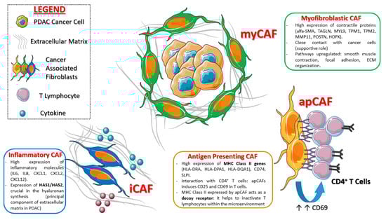 In 2017, they proved for the first time the existence of at least two different CAF phenotypes in mouse and human PDAC tissues []: Myofibroblasts (myCAFs) and inflammatory CAFs (iCAFs). These two populations activate different signaling pathways and are located in different tumor locations: myCAFs reside in close contact with cancer cells while iCAFs are located far away from neoplastic cells, in tumor desmoplastic areas.