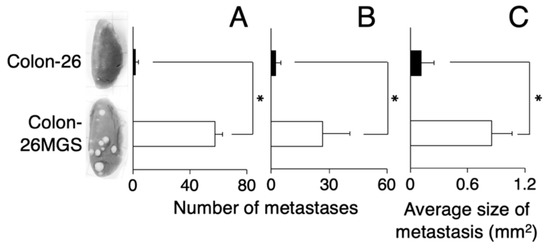 Comparison of metastatic ability between Colon-26MGS and Colon-26. Number of lung metastasis by subcutaneous injection (A) and by intravenous injection (B) of cancer cells, and size of lung metastasis nodules (C) of cancer-bearing mice. Five mice were analyzed per group. * p < 0.05 by Student’s t-test. Bars indicate standard error calculated using data from three independent trials.