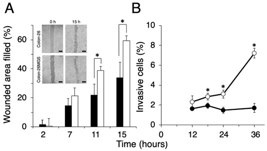 Comparison of migration and invasion ability between Colon-26MGS and Colon-26. (A) Filled wounded area of cancer cells (scale bar: 1 mm); (B) Invasion ability. Colon-26 (closed symbols), Colon-26MGS (open symbols) * p < 0.05 by Student’s t-test. Bars indicate standard error calculated using data from three independent trials.