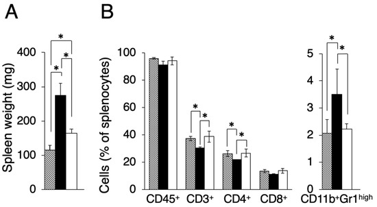 Evaluation of splenocytes in Colon-26MGS and Colon-26 bearing mice. Splenocyte populations were evaluated in tumor-free (gray column), Colon-26 (close column) and Colon-26MGS (open column) bearing mice. (A) Spleen weight; (B) Leukocytes, Total T cell, Helper T cell, and Killer T cell, MDSCs were evaluated as CD45+, CD3+, CD4+, CD8+, CD11b+Gr1high cells. * p < 0.05 by Student’s t-test. Bars indicate standard error calculated using data from three independent trials.