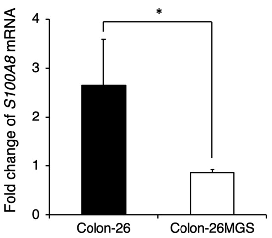 Comparison of pre-metastatic niche preparation between Colon-26MGS and Colon-26. Colon-26 or Colon-26MGS cells were transplanted into the right hind leg, and 17 days later, the lung tissue sample was collected for qRT-PCR. S100A8 mRNA expression in the lung tissue of Colon-26MGS and Colon-26 was evaluated by qRT-PCR. * p < 0.05 by Student’s t-test. Bars indicate standard error calculated using data from three independent trials.