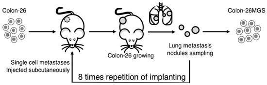 Illustration of the continuous implanting method. Colon-26 cells were grown subcutaneously in right hind paws of BALB/c mice. One month later, the mouse was sacrificed and lung metastases nodules were collected. The metastatic nodules were digested into single-cells and injected again into naïve BALB/c mice in the same manner. After eight repetitions of this process, a highly metastatic Colon-26MGS subline was established.